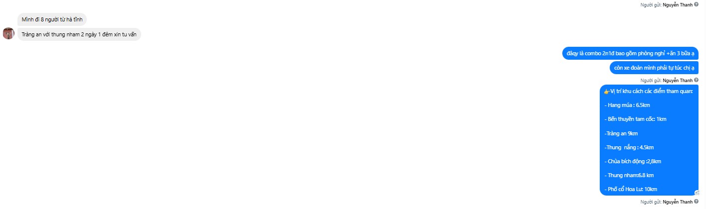 Câu này không có lời chào, không xác nhận thông tin “8 người từ Hà Tĩnh”. Khách đi xa (từ Hà Tĩnh ra Ninh Bình) họ cần sự tin tưởng, nhưng câu trả lời này tạo cảm giác Sales đang “bận việc khác nên nhắn đại”.
