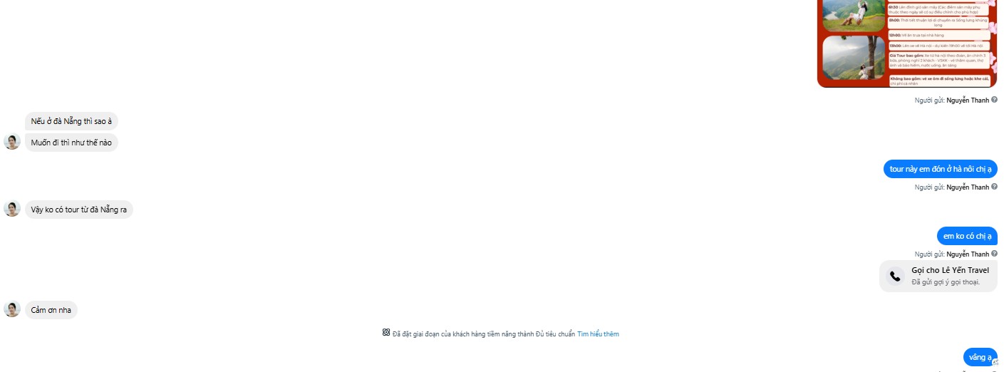 Sales: “Dạ hiện tại tour Tà Xùa bên em khởi hành từ Hà Nội chị ạ. Tuy nhiên, em có rất nhiều khách từ Đà Nẵng bay ra tham gia tour này đấy ạ!
