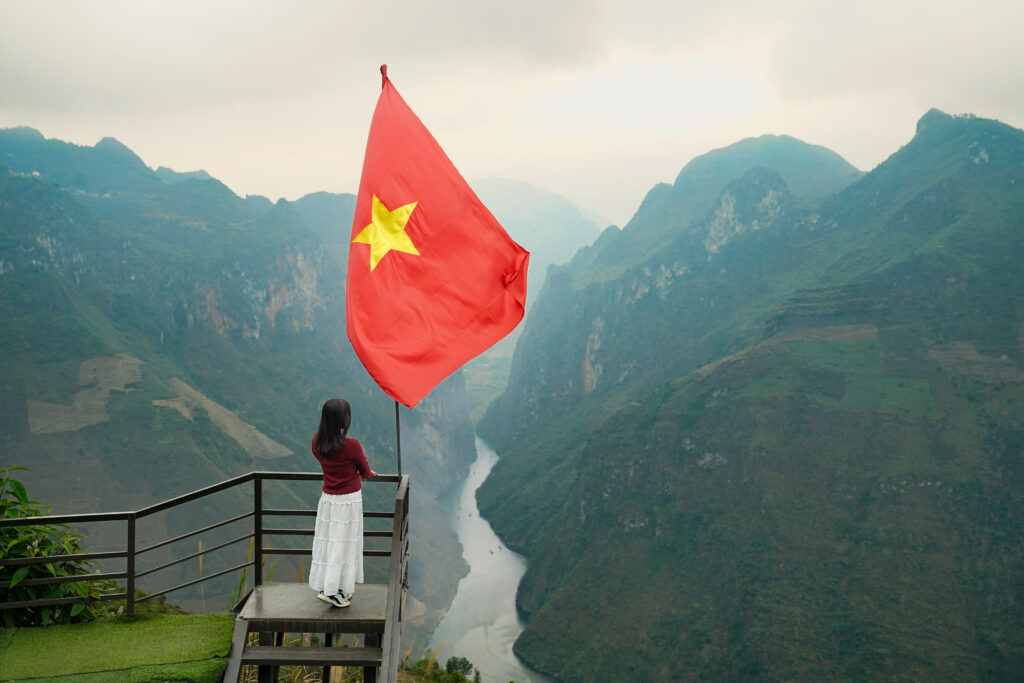 Đây là góc chụp rất phổ biến và hiệu quả dành cho khách check-in tại viewpoint Mã Pí Lèng. Góc máy từ phía sau model nhìn ra thung lũng sông Nho Quế tạo cảm giác rộng lớn, hùng vĩ. Lá cờ Tổ quốc bay giữa khung hình trở thành điểm nhấn mạnh mẽ, vừa thể hiện vẻ đẹp thiên nhiên vừa truyền tải tinh thần tự hào.